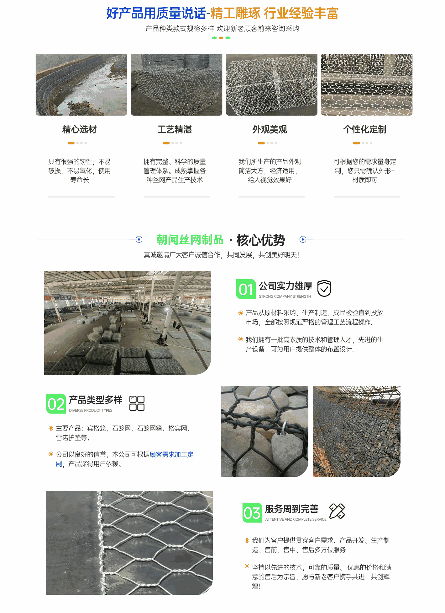深州市朝聞絲網(wǎng)制品有限公司擁有“中國(guó)絲網(wǎng)之鄉(xiāng)”美譽(yù)的河北省致力于生產(chǎn)銷售格賓網(wǎng),雷諾護(hù)墊,景觀石籠網(wǎng),邊坡防護(hù)網(wǎng),綠濱墊,固濱籠的廠家,規(guī)格多種多樣。  我廠堅(jiān)持技術(shù)創(chuàng)新、科學(xué)管理、誠(chéng)信經(jīng)營(yíng),注重引進(jìn)新型生產(chǎn)技術(shù)設(shè)備,推行標(biāo)準(zhǔn)化生產(chǎn),采用質(zhì)量管理體系,從原材料采購(gòu)、生產(chǎn)管理、產(chǎn)品檢測(cè)等關(guān)鍵環(huán)節(jié)嚴(yán)格把關(guān),確保了產(chǎn)品質(zhì)量,贏得了客戶的信賴。我公司秉承“誠(chéng)信、務(wù)實(shí)、高效”的企業(yè)宗旨,真誠(chéng)希望與世界各地客戶互惠互利,共創(chuàng)美好未來!多年來"以誠(chéng)立廠","以質(zhì)興業(yè)"。 憑借過硬的質(zhì)量、良好的信譽(yù)、優(yōu)質(zhì)的服務(wù)、合理的價(jià)格不斷拓展市場(chǎng),誠(chéng)摯的希望在平等互利,坦誠(chéng)相待的基礎(chǔ)上與國(guó)內(nèi)外客戶長(zhǎng)期合作!...